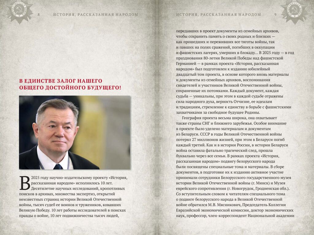 «10 лет проект «История, рассказанная народом» взывает к душам и сердцам ныне живущих, новых поколений: помните свою историю, храните память о героях и едином братском прошлом наших народов, осознайте, что в единстве залог нашего общего достойного будущего!» – говорится во вступительном слове к изданию Государственного секретаря Союзного государства Беларуси и России, академика РАН Сергея Юрьевича Глазьева.